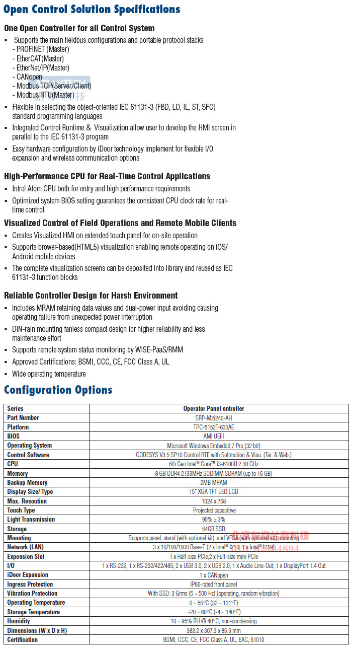 SRP-M2i240 is a complete solution-ready-package that includes PC-based cabinet controller with a fanless high-performance Intel Core™ i processor, DIN rail, 128 GB SSD, 2MB MRAM, Microsoft Windows Embedded 7 Pro, and CODESYS Control Runtime and Visualizatioin. Advantech developed its SRP-M2i240 solution to serve as a single integrated interface for conducting real-time machine control. Compliant with the IEC 61161-3 international standard, SRP-M2i240 supports object-oriented programming (OOP), allowing users to effectively reduce development time. Moreover, by enabling dual fieldbus data acquisition (PROFINET, EtherCAT, EtherNet/IP, CANopen, and Modbus TCP/RTU), SRP-M2i240 provides a cost-effective tool for control, communication, and HMI functions in vertical industries.
