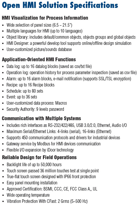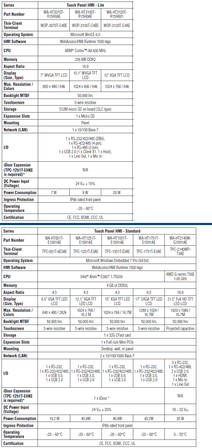 The WA-HT HMI standard series is a complete application-ready-package which includes a Thin Client Terminal with panel sizes from 6.5"~21.5" TFT LCD, 32GB CFast card, Microsoft Windows Embedded 7 Pro and WebAccess/HMI Runtime. This allows users to easily achieve efficient, integrated HMI solutions for flexible system integration in automation industries. The Thin Client Terminal with Intel ® Atom™ or relevant processor providing computing performance in a compact fanless system for any field side operation.