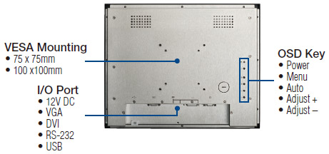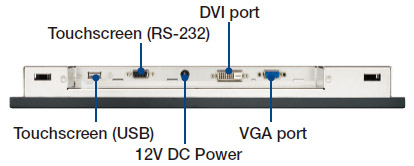 I/O VGA x 1; DVI-D x 1; 12 Vdc Jack x 1; USB x1; RS-232 x 1 (USB & RS-232 are reserved for the connection to enable touch usage only)