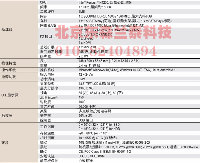 18.5寸宽屏工业平板电脑,多点触控电容屏,Intel® Pentium® N4200四核心处理器 |