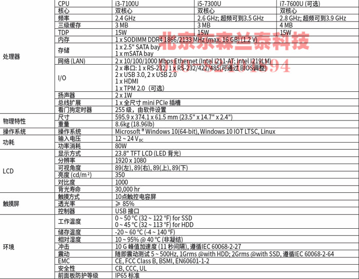 Intel® Core™ i3-7100U无风扇工业平板电脑 23.8"全高清LED背光 |