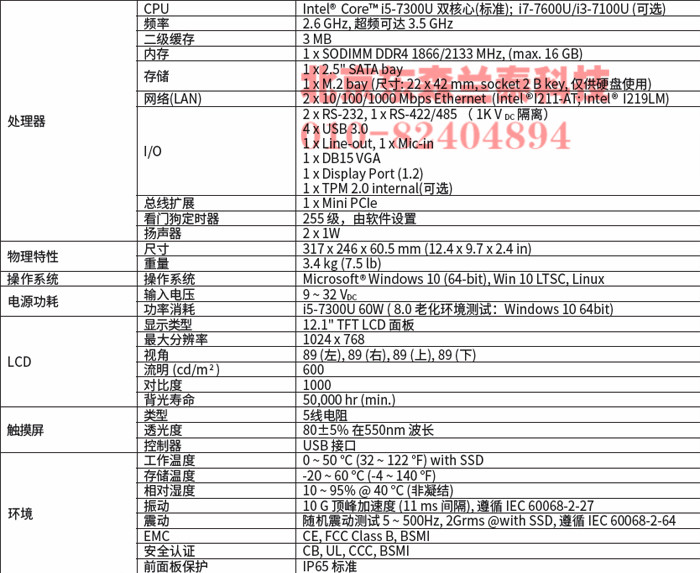 Intel® Core™ i5-7300U无风扇工业平板电脑 12.1" XGA LED背光,电阻触摸屏 |