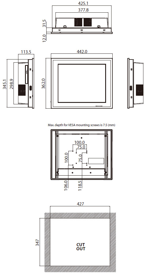 Physical Dimensions PPC-6150A: 395.5 x 316.8 x 105.5 (mm) (15.6" x 12.5" x 4.15")