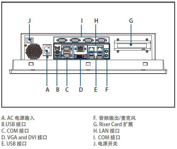 6 COMs, 1 x RS-232/422/485, 5 x RS-232 6 x USB2.0 1 x VGA, 1 x DVI 1 x GPIO, 8 bits (Internal pin header) 2 x Ethernet 1 x Mic-in, 1 x Line-out 1 x PS/2 2 x 1.5W speaker |