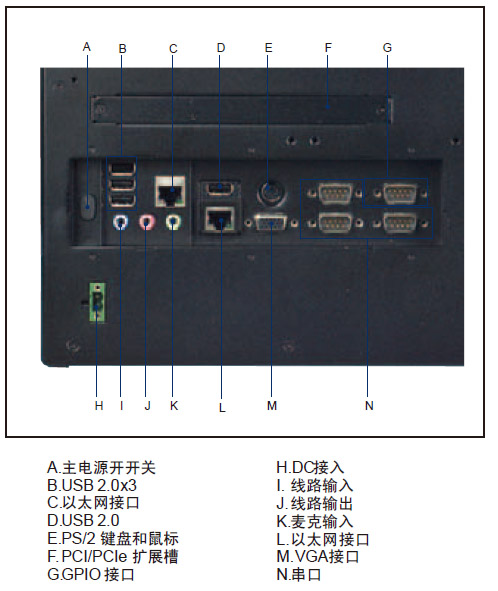 3个串口 : RS-232 x 2, RS-232/422/485 x 1; 1 个GPIO接口 1个VGA端口;PS/2鼠标和键盘 线路输入/线路输出/麦克输入 内置1W x2扬声器;USB 2.0 x4 |