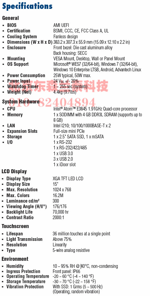 15" XGA Panel PC, Intel® Atom™ E3845 1.91GHz Quad-core Processor, 4GB (True-flat touchscreen) |