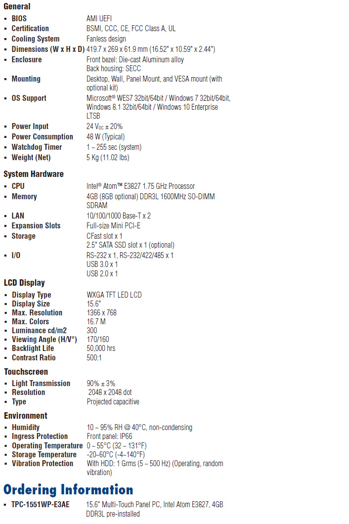 | TPC-1551WP-E3AE | 15.6" Multi-Touch Panel PC, Intel Atom E3827, 4GB DDR3L pre-installed |