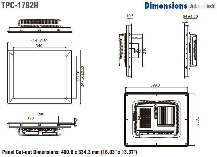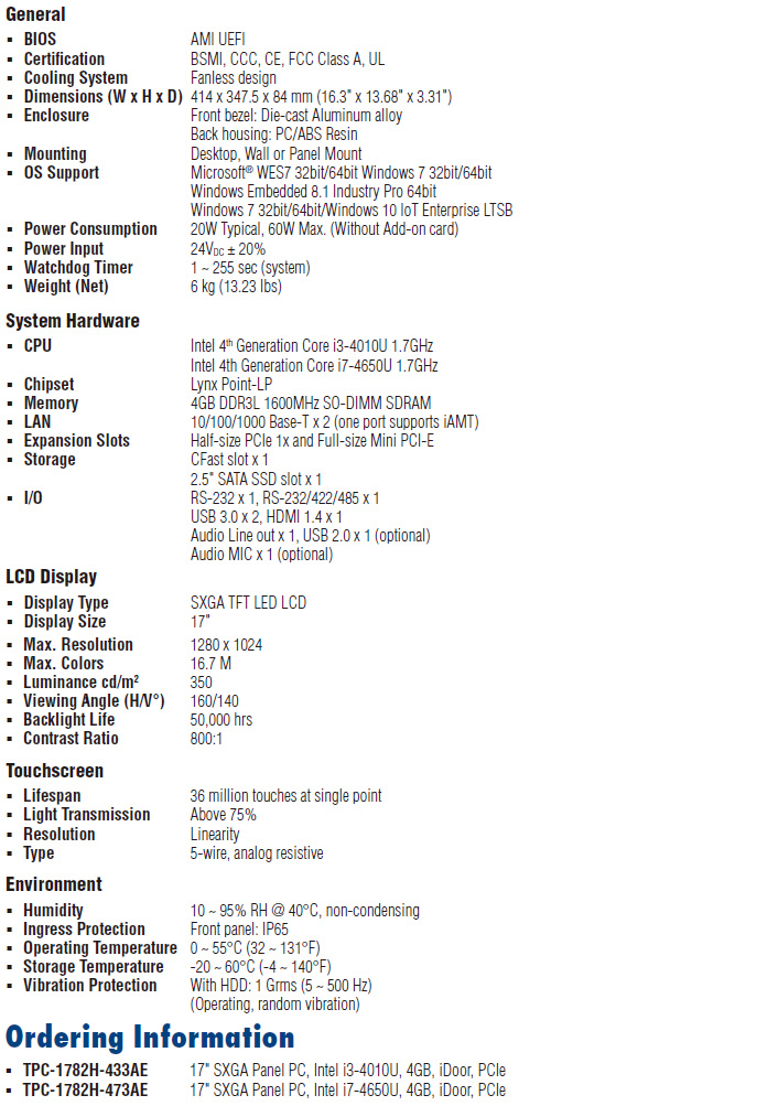 The TPC-1782H touch panel computer with a 17" SXGA LCD, low power embedded Intel 4th Generation Core i3 1.7GHz processor and 4GB DDR3L SDRAM provides the high computing performance in a compact fanless system. To enhance its durability, the TPC-1782H is designed with IP65 front protection, die-cast Al Alloy front bezel and 5-wire resistive touch. It also includes PCIe slot and Mini-pcie slots to extend the functionality and meet a variety of automation applications needs. Through the Mini-PCIe slot, Advantech iDoor technology can provide more I/O connectors, Isolated Digital IO, the Fieldbus Protocol, 3G/GPS/GPRS/WiFi Communication and MRAM. A 2nd monitor and speaker can be attached via the intergrated HDMI and Audio port.