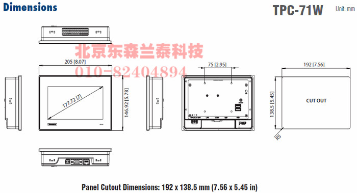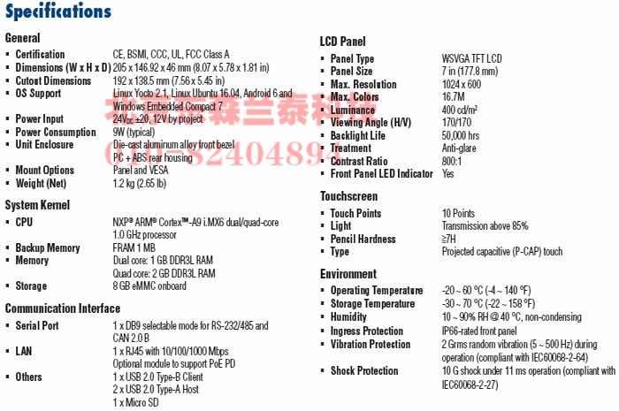 7寸16:9 WSVGA液晶显示屏(LCD),多点触摸全平面,前面板防护等级IP66