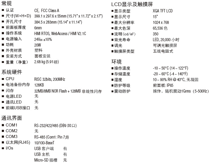 15" XGA工业级可编程人机界面,支持研华WebAccess/HMI组态软件