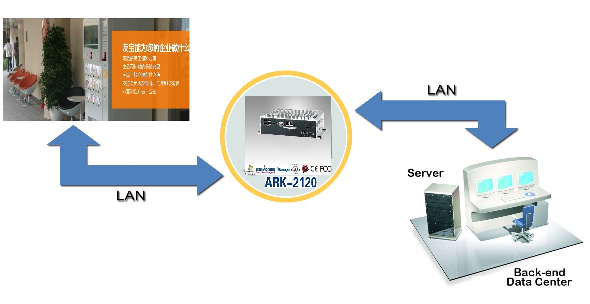 研华无风扇嵌入式工控机ARK-2120为该用户的需求提供了理想的解决方案。这款产品的CPU平台为D2550. 图形核心频率提升到了640MHz,VGA&HDMI双显支持.完全能够满足设备对互动游戏及数字多媒体广告的图形支持.研华的SUSIACCESS & IManage能够完美的帮助去实现机器状态的远端控制管理.双千兆以太网的支持,能够帮助UBOX设备良好的完成网络传输及数据的实时反馈.
