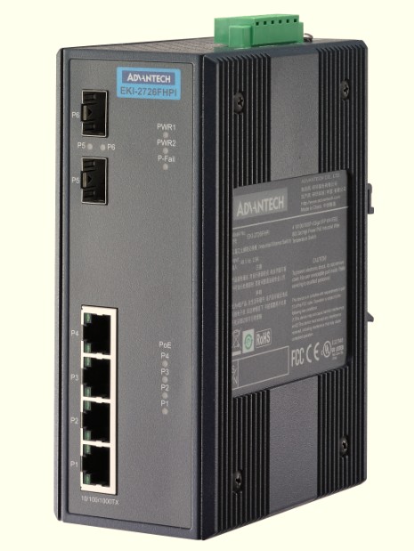 研华科技,2013年3月—全球领先的创新嵌入式产业电脑&自动化解决方案提供厂商研华科技推出一款千兆非网管型工业PoE交换机EKI-2726FHPI,其支持IEEE 802.3at标准,带有4端口千兆以太网口及2个SFP端口。