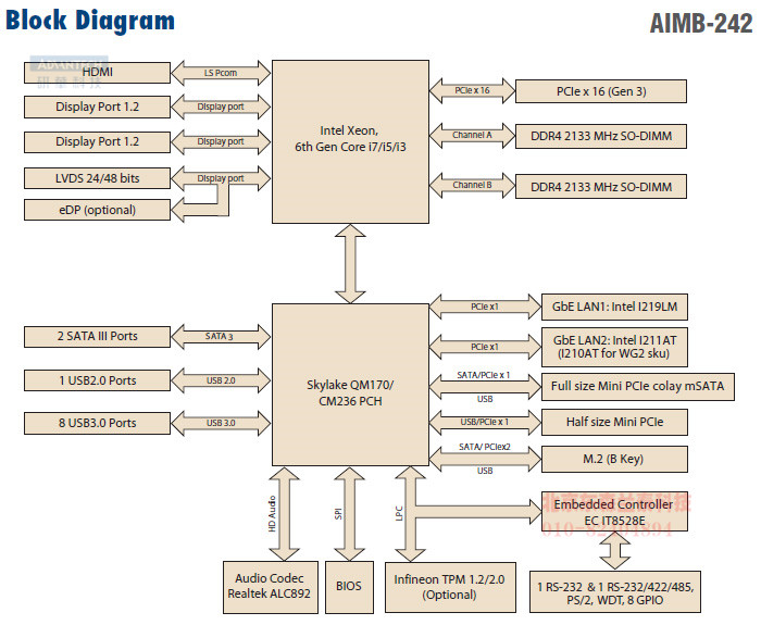 支持 PCIe x16 (Gen 3), 2 MiniPCIe, M.2, 8 USB3.0 & 1 USB2.0, 2 SATAIII